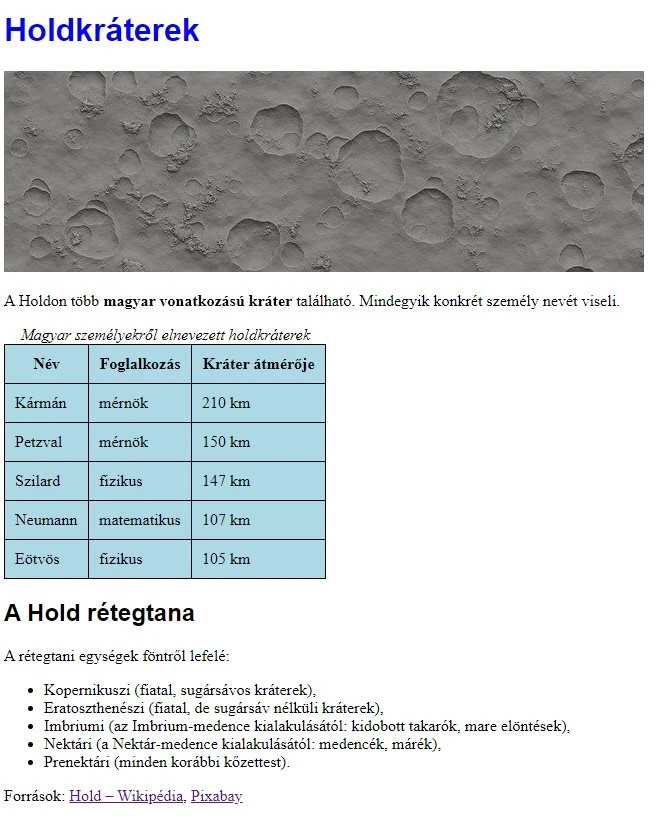 - A Holdkráterek szöveg egyes címsor legyen és sötétkék színnel jelenjen meg!